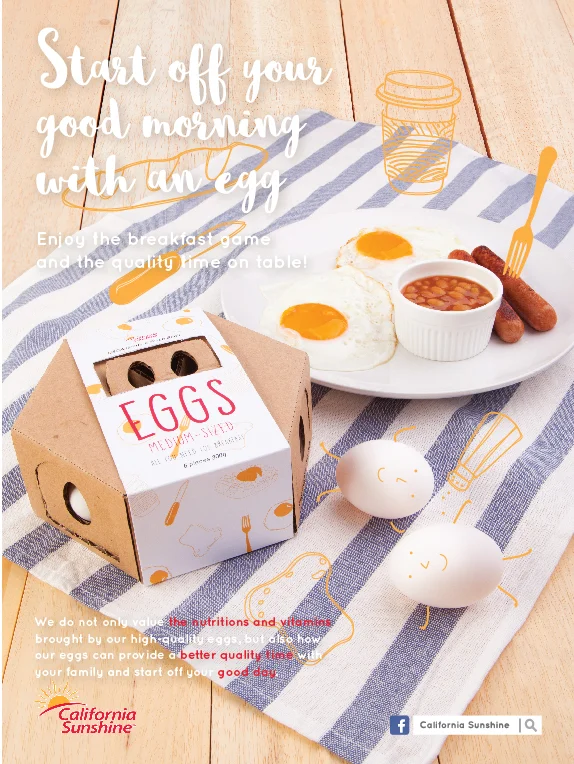 The collection of photos was themed warm and energetic atmosphere of breakfast time, yet in a cleaner and friendlier way. Some props for breakfast such as tablecloth, cutlery and all-day breakfast were displayed with the egg package. In order to show interaction between the eggs, the package and the breakfast, some shots were made to show the playful and energetic mood, such as the photo which shows the door of beans with a cup of real beans.